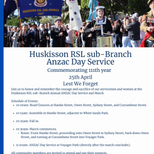 Huskisson RSL sub-Branch Anzac Day Service and March Huskisson RSL sub-Branch Anzac Day Service and March Commemorating 111th years 25th April Lest We Forget Join us to honor and... 25 Apr 10:00 am - 12:00 pm Voyager Memorial Park Huskisson Entry via Owen St or Currambene St Huskisson