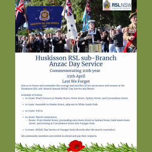 Huskisson RSL sub-Branch Anzac Day Service Huskisson RSL sub-Branch Anzac Day Service and March Commemorating 111th years 25th April Lest We Forget Join us to honor and... 25 Apr 10:00 am - 12:00 pm Voyager Memorial Park Huskisson Entry via Owen St or Currambene St Huskisson