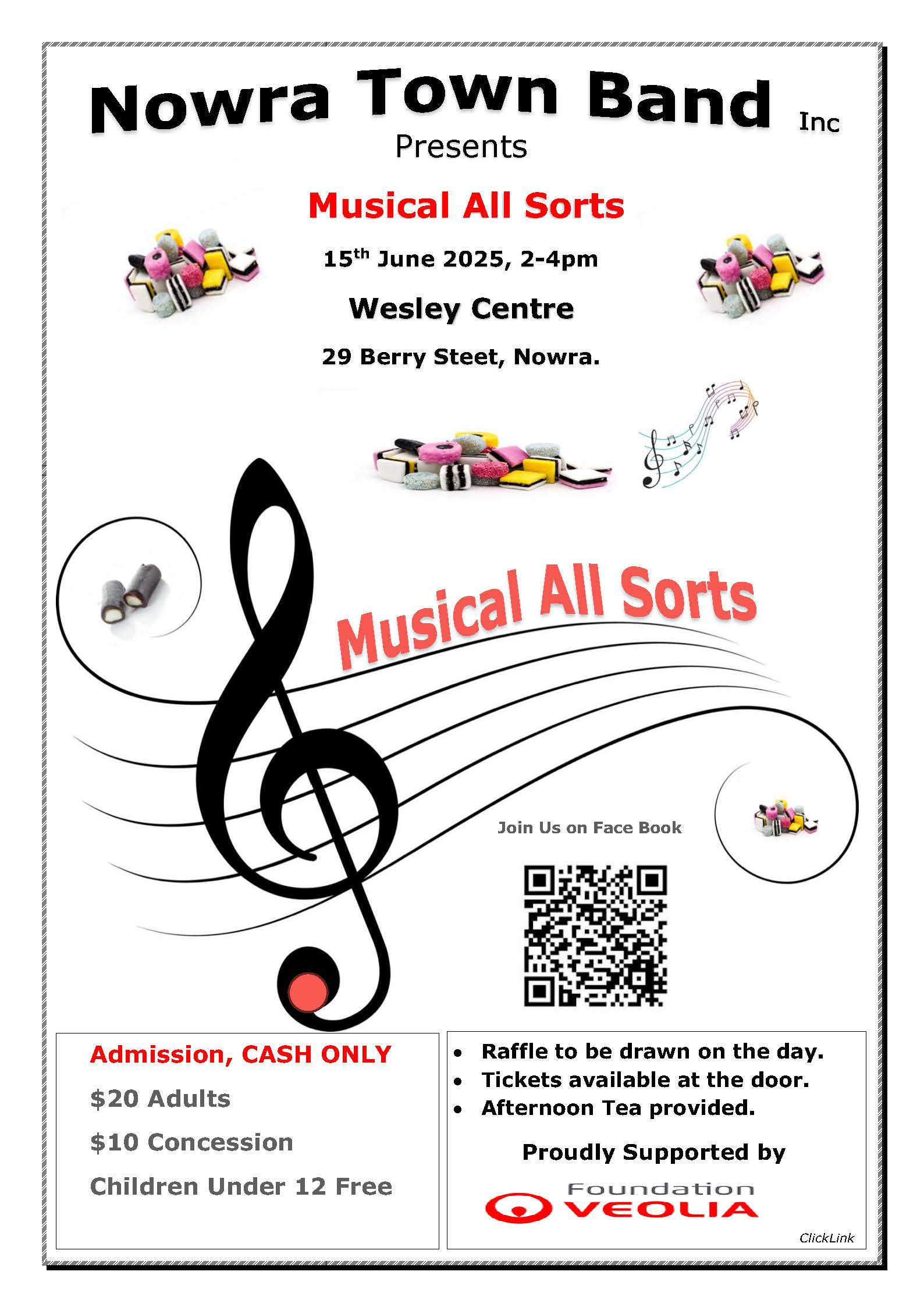 Nowra Town Band presents, A musical Program of ALL SORTS. A musical program to suit all tastes, an afternoon Tea, Raffle. Admission $20 Adults, $10 Concession, Children under 12yrs free. Sunday 15th June 2025. Cash please.